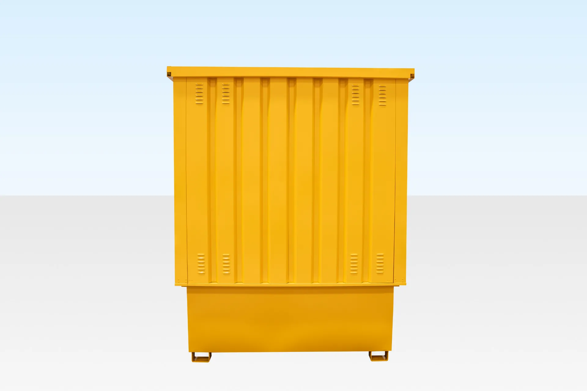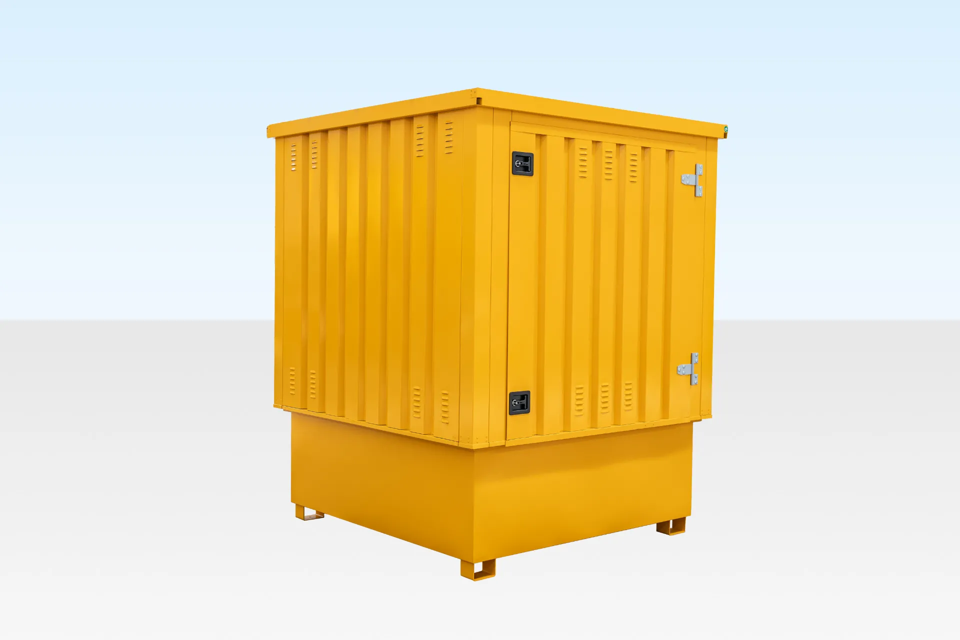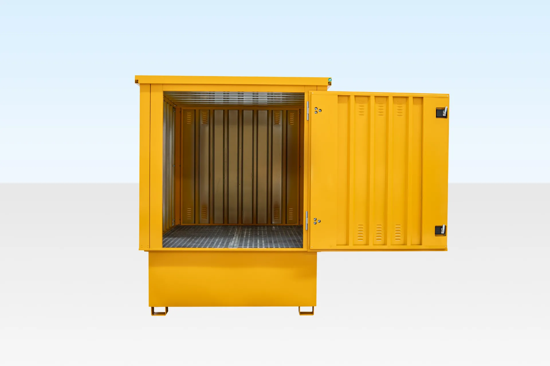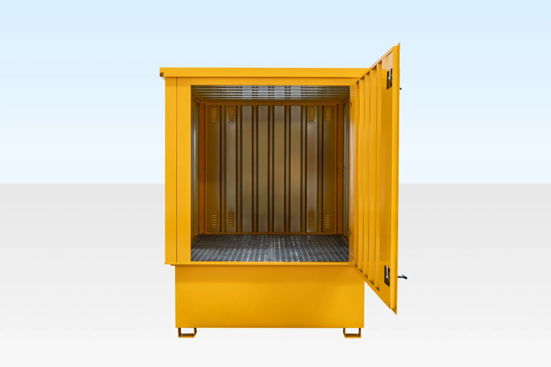 This Single IBC Flat Pack Store safely holds one IBC container, whilst complying with site chemical safety storage regulations. Featuring no upstand lip and a fully opening door to allow for easy forklifting of IBC’s in and out, a sumped base for contained spillage and a suspended grated floor.